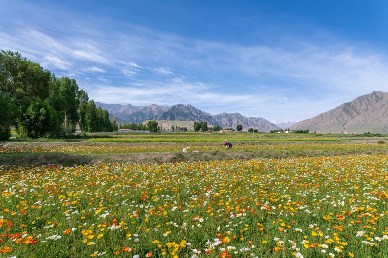 時(shí)值盛夏,地處祁連山北麓高海拔山區(qū)的甘肅省高臺(tái)縣新壩鎮(zhèn)紅沙河村種植的虞美人繽紛綻放,形成花海景觀。近年來(lái),高臺(tái)縣新壩鎮(zhèn)將花卉蔬菜制種作為特色產(chǎn)業(yè)來(lái)抓,積極引導(dǎo)農(nóng)戶規(guī)模化、集中化種植,成為當(dāng)?shù)剞r(nóng)業(yè)增效、農(nóng)民增收的支柱產(chǎn)業(yè)之一。
